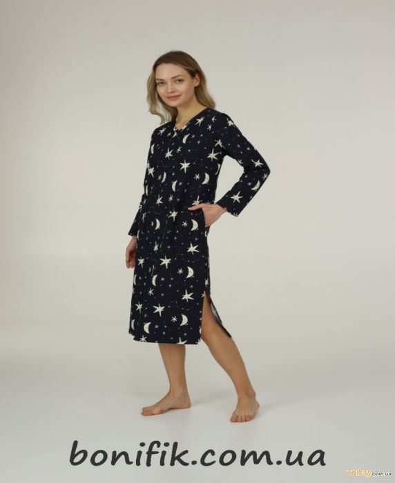 Нужный размер и цвет, указывайте в комментариях к заказу! Женская домашняя сорочка из новой коллекции "Good Night" от украинского производителя ТМ "ELLEN". Изделие изготовлено из хлопковой ткани с добавлением эластана. Ночная сорочка свободного силуэта, выполнена в черном цвете с принтом "полумесяц и звёзды". Ночнушка удлиненная, имеет высокий вырез по бокам. Материал очень приятный к телу, мягкий и не вызывает аллергических реакций. В нашем интернет магазине, мы будем рады каждому покупателю! Цвет: черный Размер: S Состав: 95% хлопок, 5% эластан Информация о продавце