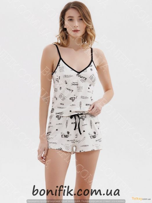 Нужный размер и цвет, указывайте в комментариях к заказу! Шикарная пижама женская из коллекции "Dreamy Hearts" от украинского производителя ТМ "Roksana". Комплект пижамы изготовлен из хлопковой ткани, которая хорошо пропускает воздух, приятная на ощупь. Не вызывает раздражений на коже, способна впитывать влагу, хорошо стирается и быстро высыхает. Комплект пижамы приталённого кроя, состоит из маечки на тонкой бретели и шортиков. Шорты короткие, с мягкой резинкой на поясе, украшенные красивым принтом надписей. Состав: 95% хлопок, 5% эластан Размер: S, M, L, XL, XXL, XXXL Цвет: белый Информация о продавце